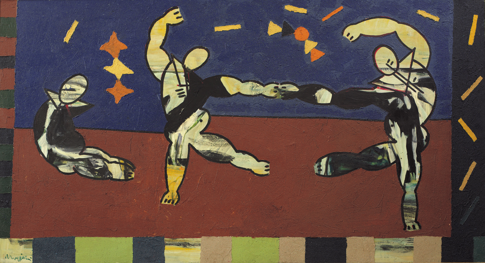 PIERO MAGGIONI Monticello Brianza (Co) 1931 - Vigano' (Co) 1995 Senza titolo olio su tela cm. 146x270, firma in basso a sinistra, opera registrata presso l'archivio Piero Maggioni come da dichiarazione firmata dal figlio Antonio su foto, presenta un leggero restauro a sinistra.