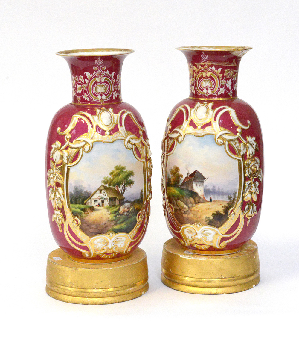 Manifattura del secolo XIX. Coppia di vasi in ceramica decorata in policromia a paesaggi entro riserve in rilievo a dorature (h. cm 38) Su basi in legno dorato non coeve (difetti e restauri)