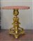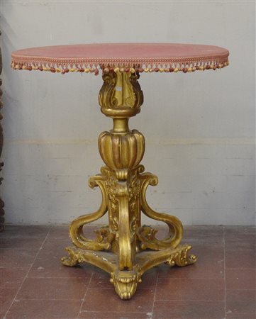 Tavolino da salotto con piano di forma ovale poggiante su supporto a colonna in legno intagliato e dorato a volute fogliate e stemmi. Piedi sagomati. Secolo XIX (cm 80x77x55) (difetti)