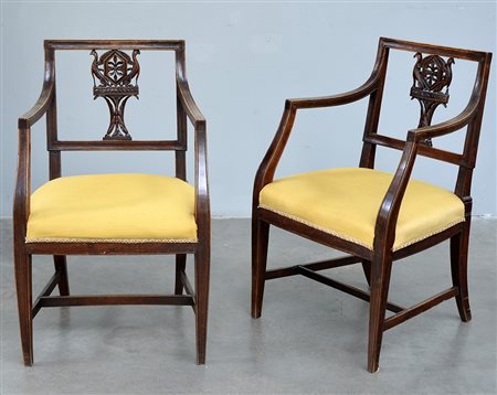 Coppia di poltrone in noce con schienale traforato e intagliato a volatili e...