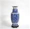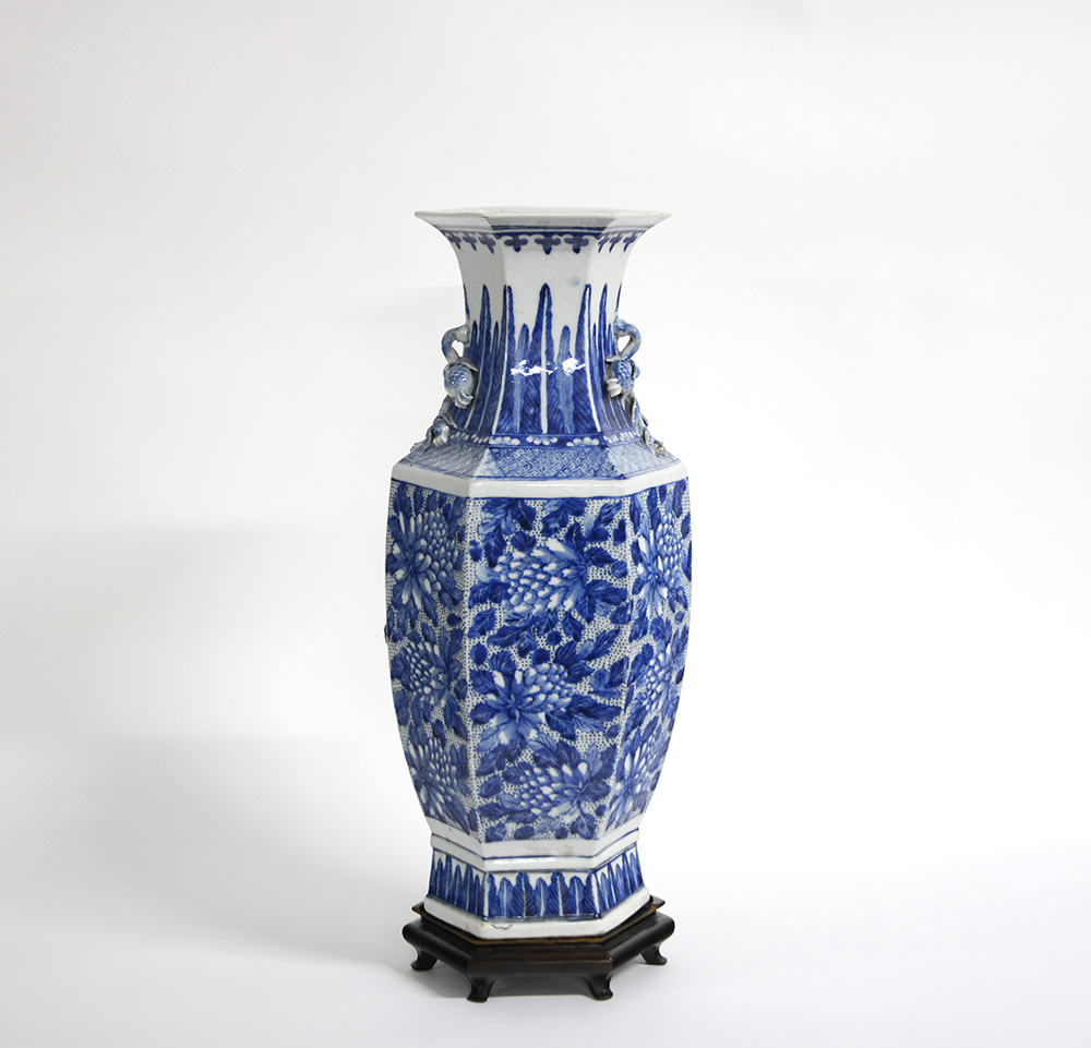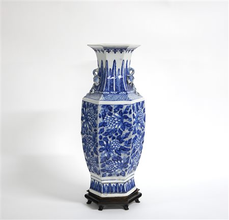 Vaso esagonale a balaustro in porcellana bianca e blu con decori floreali e anse in rilievo a guisa di melograni, base in legno (h. cm 59) (difetti e mancanze)