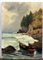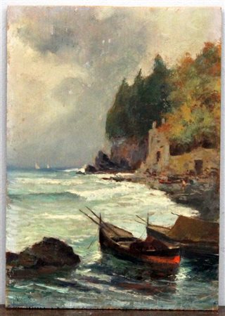 "Paesaggio marino con barche" olio su tavoletta (cm 32x23) Firmato in basso a sinistra (difetti)