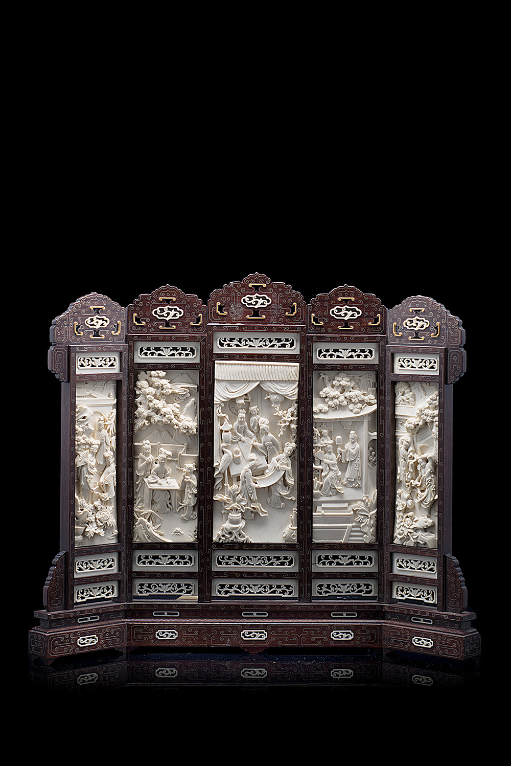 Schermo da tavolo con cinque pannelli in avorio scolpiti con dame in padiglioni e giardini, con cornice e base in legno