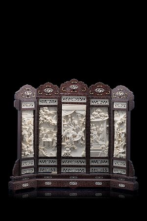 Schermo da tavolo con cinque pannelli in avorio scolpiti con dame in...