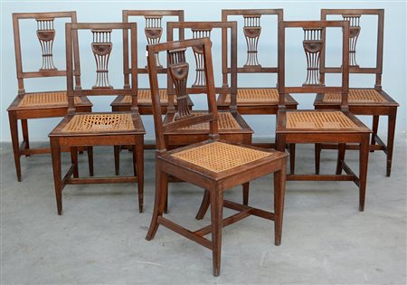 Gruppo di otto sedie in noce con schienale a cartella intagliata e traforata...