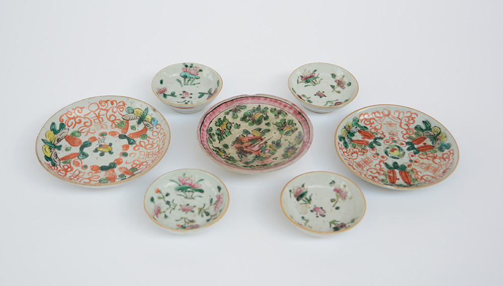 Sette piattini in ceramica policroma, vari decori e misure (difetti e restauri)