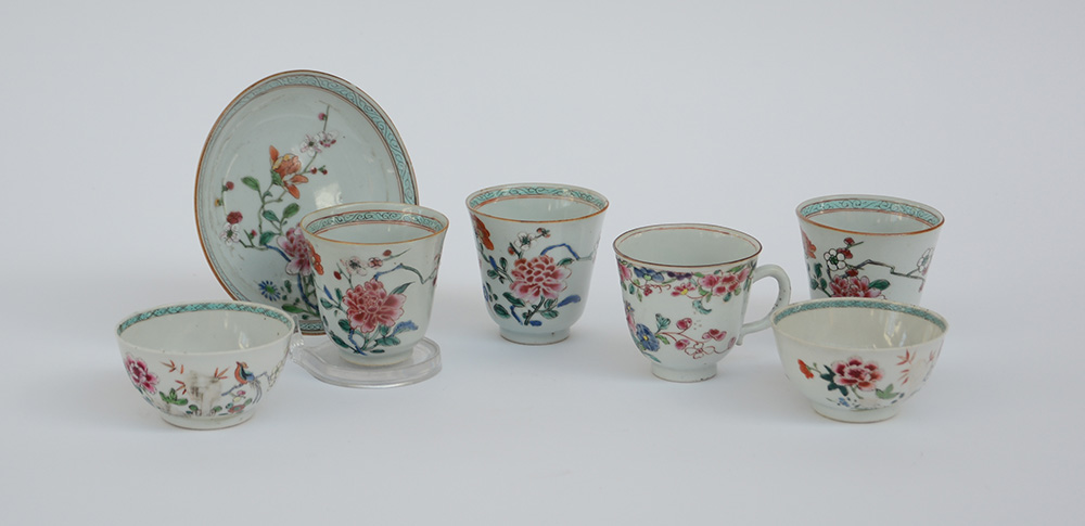 Sei tazzine ed un piattino in porcellana Famiglia Rosa a decoro floreale (d....