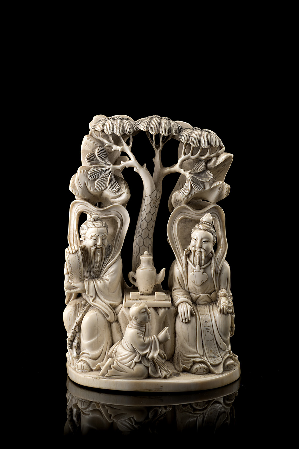 An ivory group depicting sages drinking tea, mark to the base (defects and restorations)