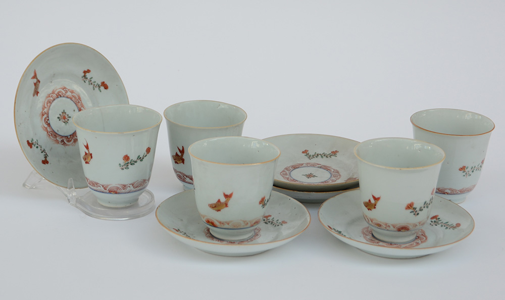 Set di cinque coppette con piattino in porcellana policroma in rosso ferro e oro, con carpe (d. cm 13) (difetti)