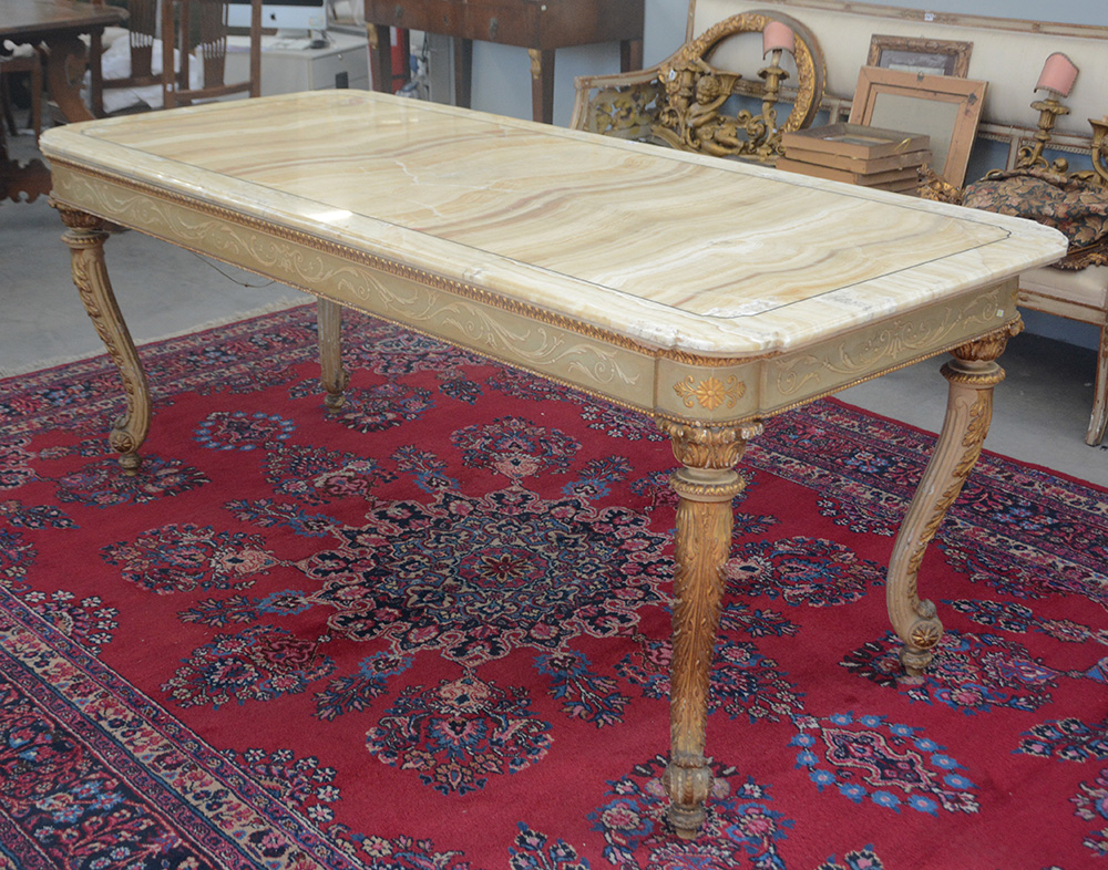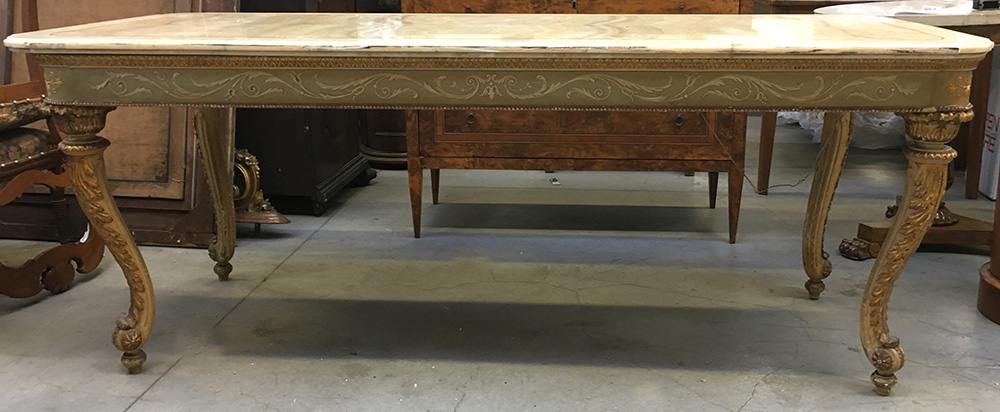 Tavolo in legno intagliato a motivi fogliacei, laccato e dorato, con piano in alabastro (cm 204x80x87) (difetti)
