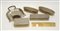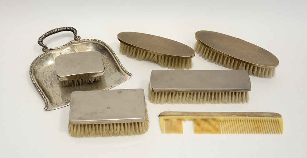 Set di spazzole e pettine e un raccogli briciole in argento e metallo (difetti)