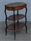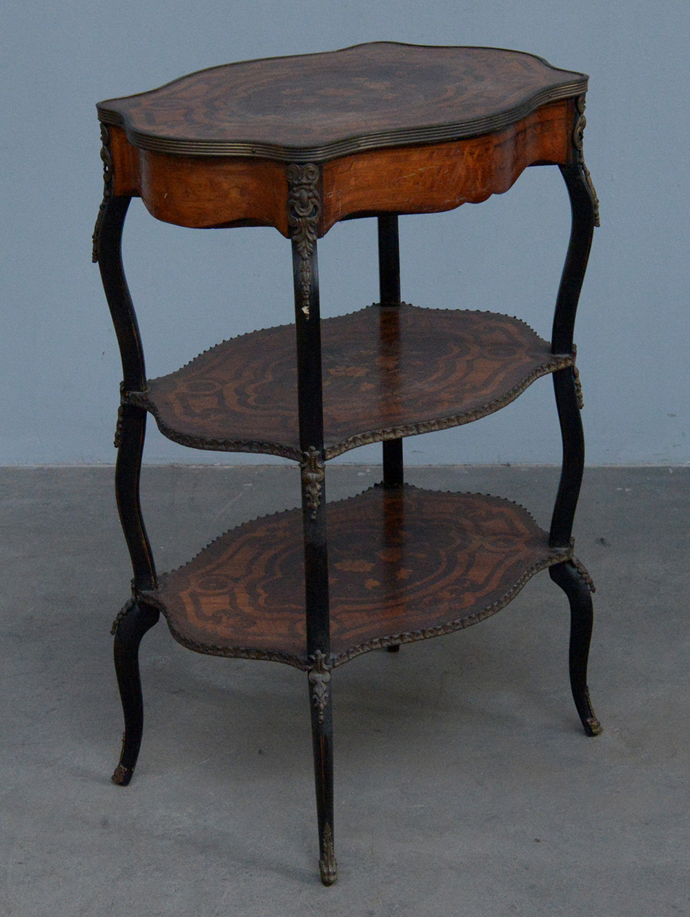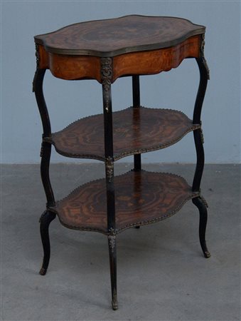 Etagere a tre ripiani di forma mossa con cassetto nella fascia, gambe ebanizzate, decorato a intarsi floreali e guarnizioni in metallo (h. cm 55x80x40) (difetti)