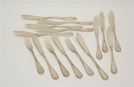 Lotto in argento composto da dodici coltelli da pesce e tre forchettine (gr...