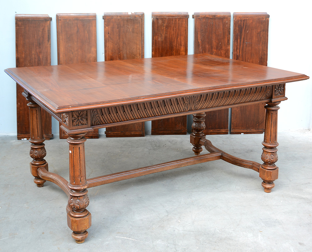 Tavolo in noce con gambe intagliate (cm 163x111x82) munito di sei prolunghe (difetti)