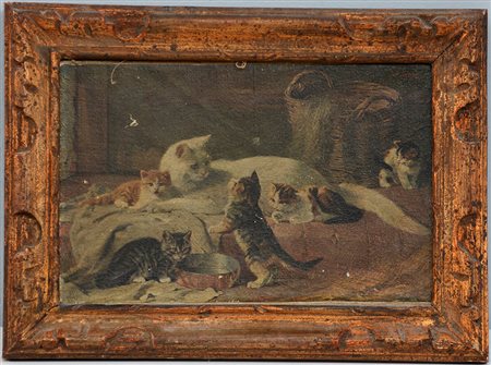 Stampa a colori raffigurante interno con gatti (cm 16x24) In cornice dorata