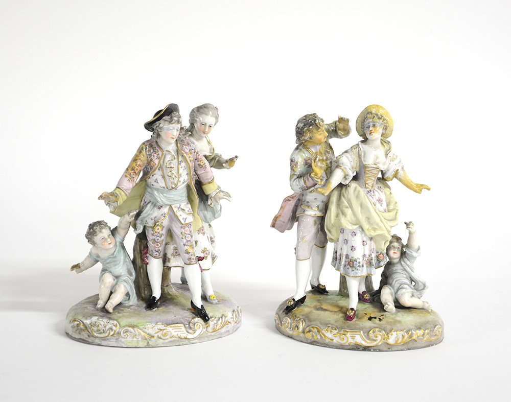 Lotto di due gruppi in porcellana policroma raffiguranti il gioco della mosca cieca in abiti settecenteschi, marcati sotto la base (h. cm 21) (gravi difetti, restauri e mancanze)