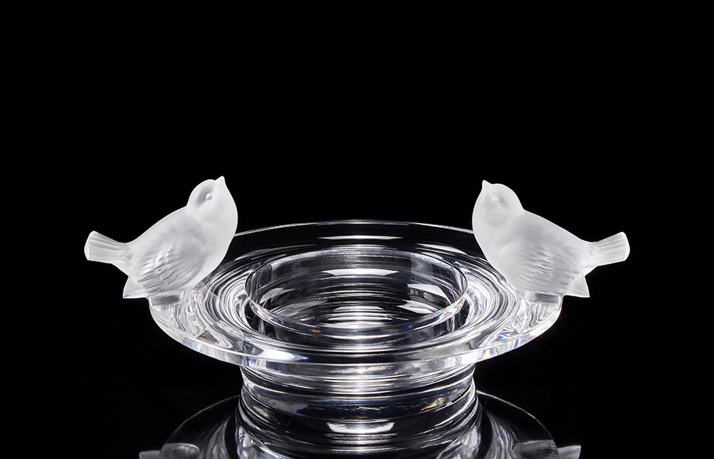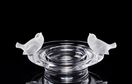 Lalique, Francia Centrotavola in vetro soffiato in stampo decorato a volatili...