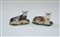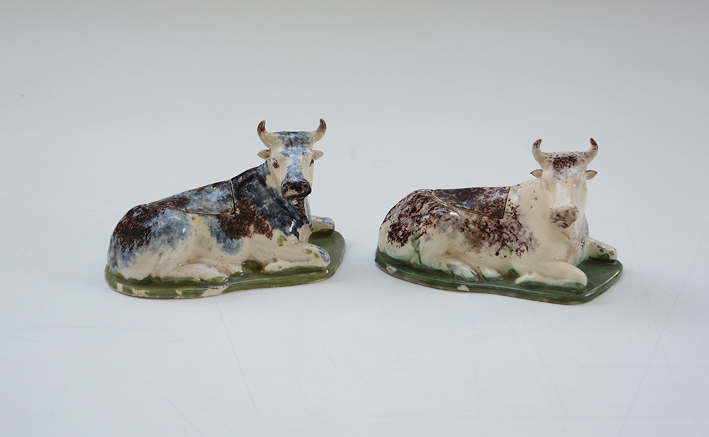 Manifattura dell'inizio del secolo XIX. Coppia di burriere in ceramica policroma raffiguranti mucche (difetti)