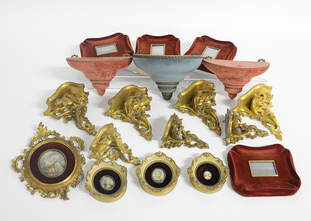 Cartone contenente numerose mensole di differente fattura e alcune miniature in cornici (difetti)