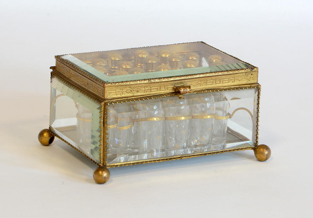 Cofanetto in cristallo con struttura in metallo contenente diciotto snuff bottle (difetti)