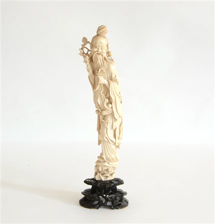 Scultura in avorio raffigurante l'Immortale Shoulao (h. cm 32) base in legno (difetti)
