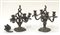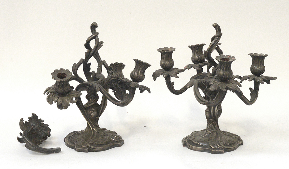 Coppia di candelieri a quattro fiamme in metallo, decorati a motivi vegetali (gravi difetti)