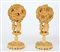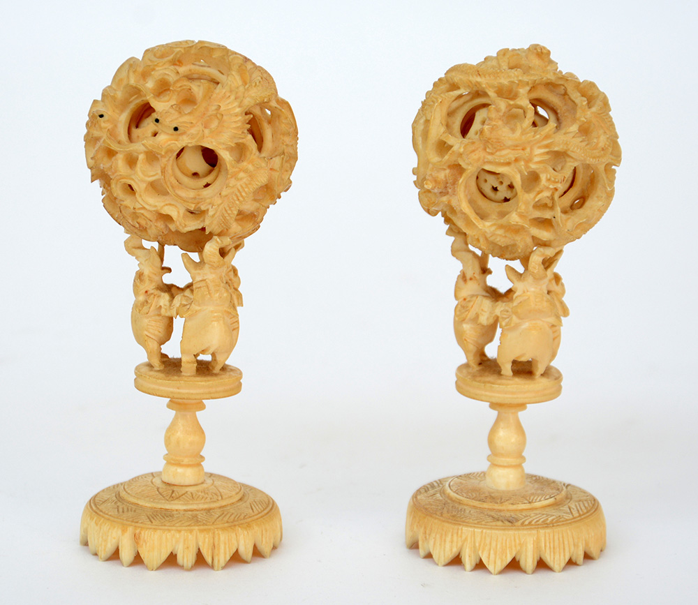 Coppia di sfere concentriche scolpite e intagliate in avorio dotate di supporti con elefanti (difetti)