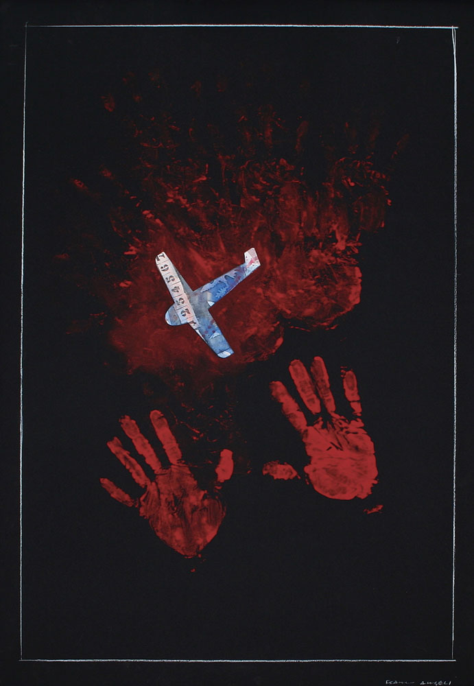 FRANCO ANGELI Roma 14/05/1935 - Roma 12/11/1988 Impronte, 1976 smalto e collage su cartoncino nero cm. 100x70, firma in basso a destra, opera registrata presso l'Archivio Franco Angeli (Angiolino Calestani) come da dichiarazione su foto.