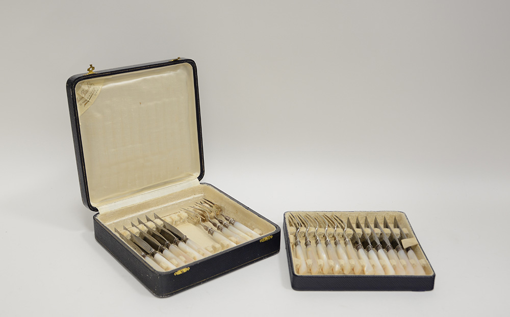 Parte di servizio da dolce con manici in madreperla composto da dieci forchette in argento e dodici coltelli, in custodia. Francia, secolo XIX (difetti)