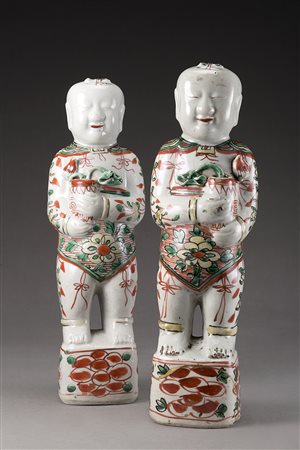 Coppia di statue raffiguranti fanciulli, in porcellana decorata a smalti della Famiglia Verde wucai