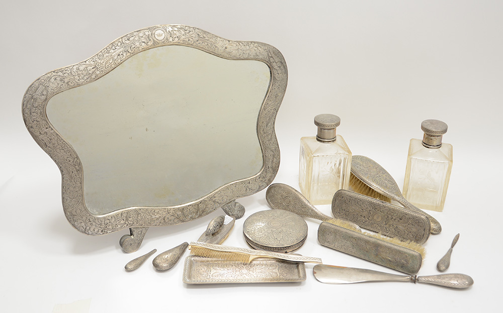 Servizio da toilette in argento composto da un vassoietto, quattro spazzole, un attrezzo da manicure, due bottiglie in vetro, un tampone, un pettine, un manico, uno specchio