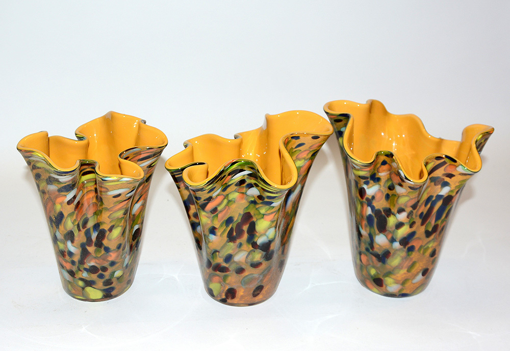 Lotto composto da tre vasi a fazzoletto in vetro policromo, interno in vetro giallo (h max cm 21)