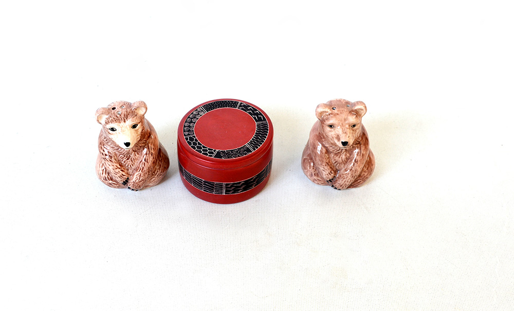 Lotto composto da una scatola in ceramica rossa decorata con elementi geometrici (d cm 7, h cm 4,5) e due orsetti sale/pepe in ceramica