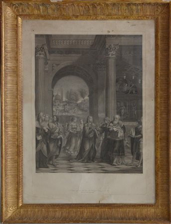 Antonio Gibert. Stampa raffigurante un affresco nella chiesa di Saronno (cm 90x70) In cornice napoletana del secolo XIX intagliata a palmette (difetti)