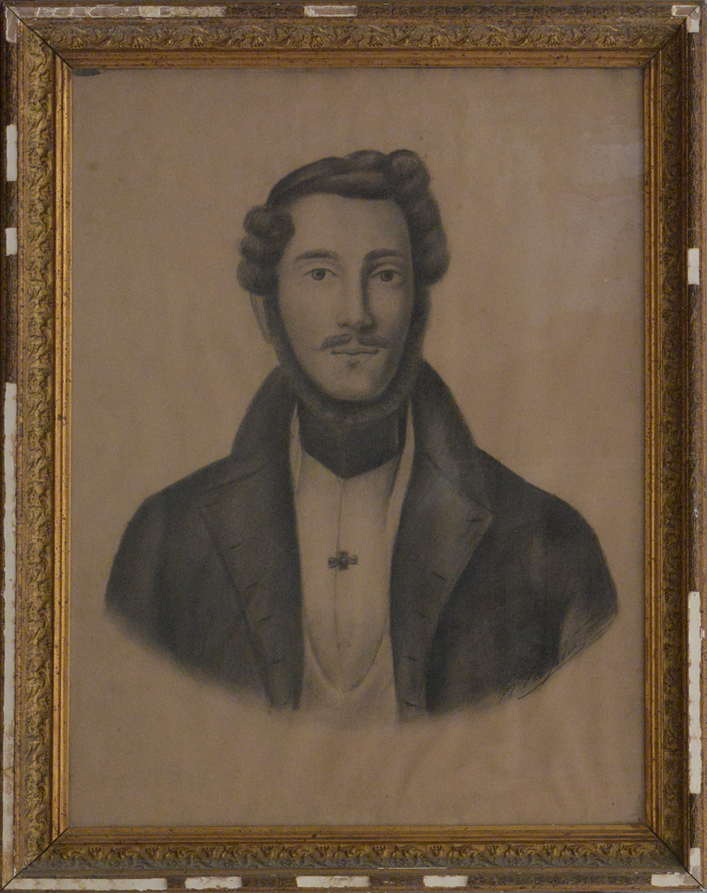 Firma indecifrata, secolo XIX "Ritratto di gentiluomo" carboncino su carta (cm 70x60) In cornice in legno e pastiglia dorata (difetti e mancanze)