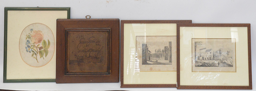 Lotto composto da due incisioni, una lastra di rame incisa con veliero e un tessuto della fine del secolo XIX raffigurante una rosa. In cornici (difetti)