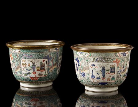 Coppia di cachepot in porcellana Famiglia Verde, bordate in bronzo...