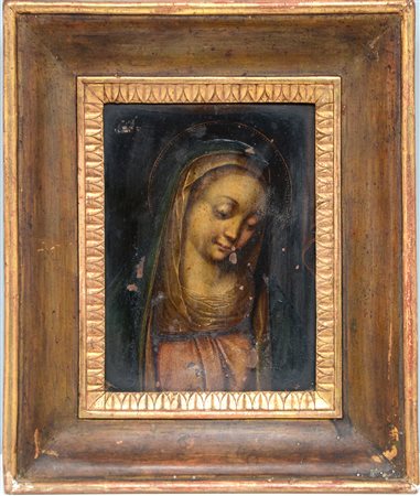 Scuola del secolo XVIII "Vergine" Olio su rame (cm 23x17,5) In cornice del secolo XIX in legno dorato (difetti)