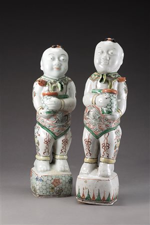 Coppia di statue raffiguranti fanciulli, in porcellana decorata a smalti della famiglia verde wucai