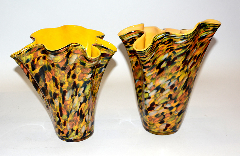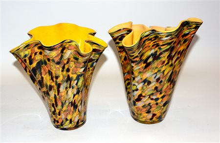 Lotto composto da due vasi a fazzoletto in vetro policromo, interno in vetro giallo (h max cm 31)