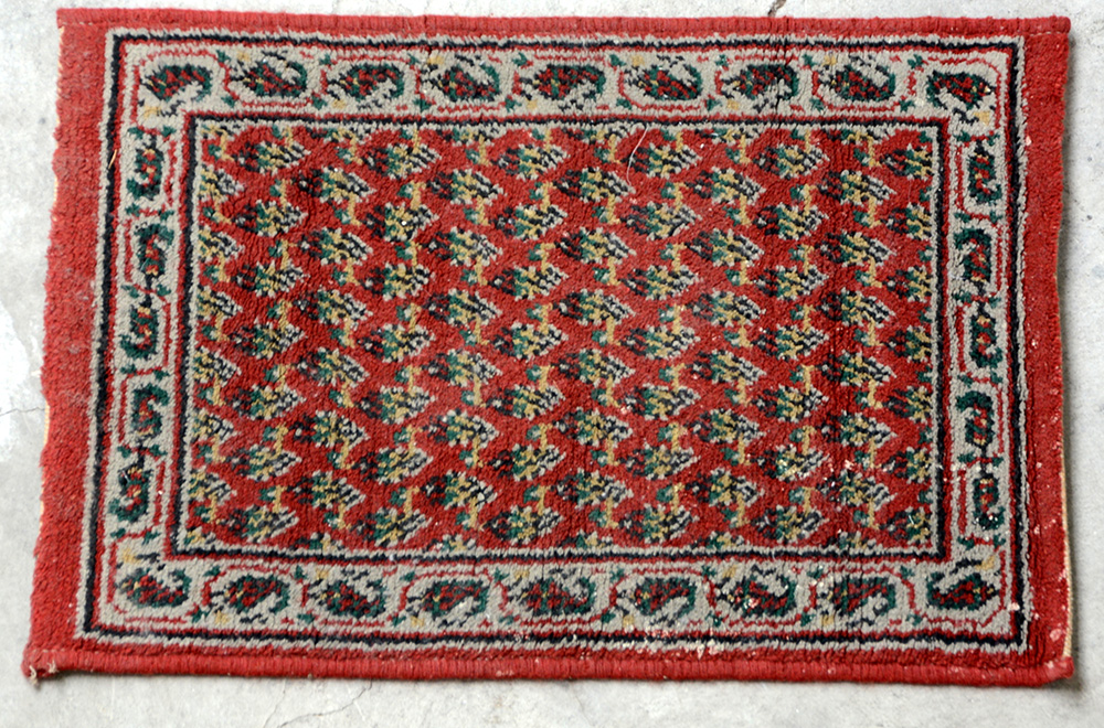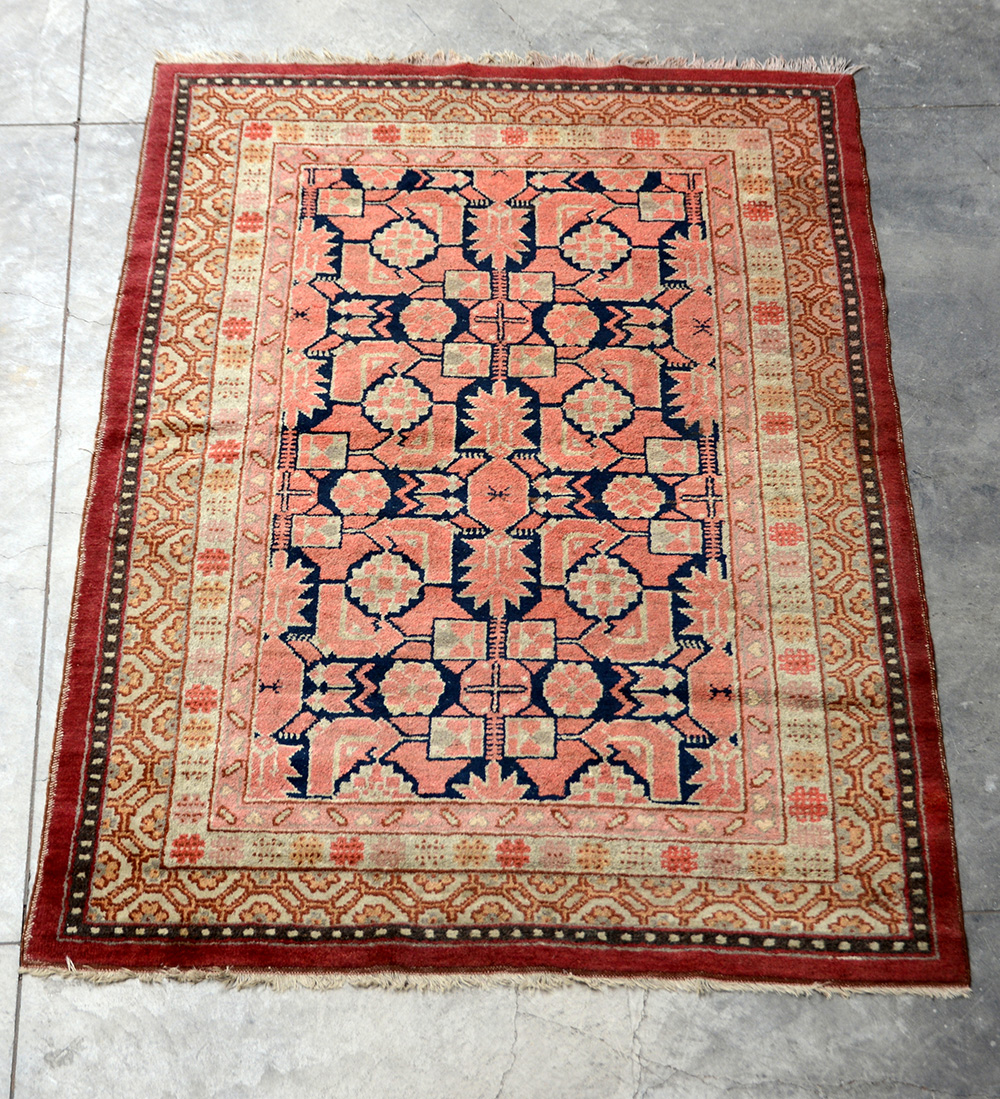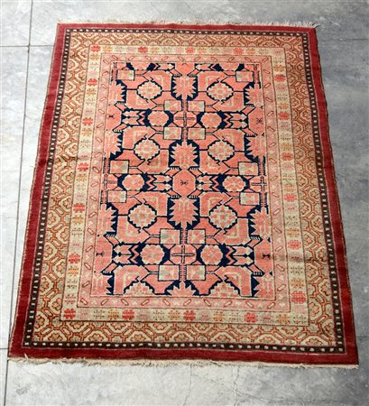 Lotto di due tappeti il più grande (cm 190x133) decorato con motivo geometrico turkomanno su fondo blu. Il più piccolo (cm 60x41) meccanico decorato con file di boteh su fondo rosso (difetti)