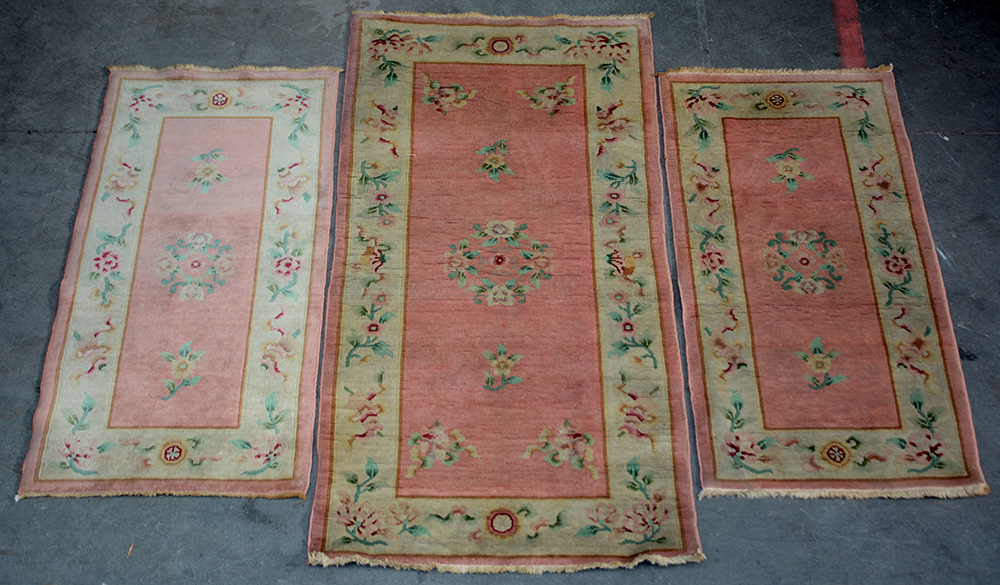 Tappeti Parure per camera da letto, Cina secolo XX. Decorati con simboli floreali nei toni del verde e beige su fondo rosa. Bordura a fondo bianco (il più grande cm 175x90; cm 135x66) (difetti)