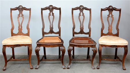 Lotto composto da due coppie di sedie venete in noce con schienale a cartella traforata e gambe mosse intagliate all'attacco a simil decoro. Epoche diverse (difetti)