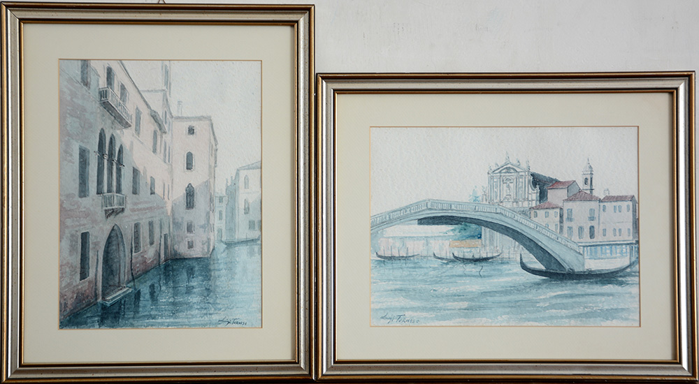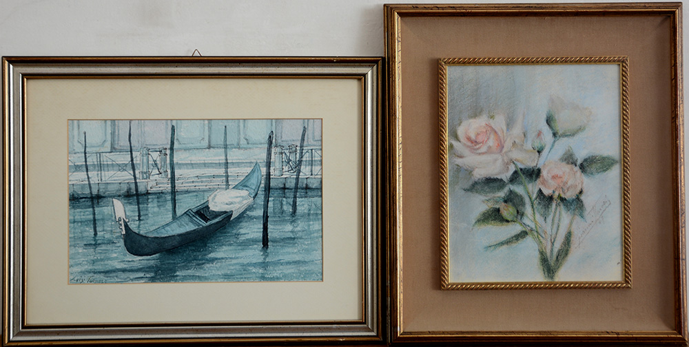 Lotto composto da tre acquerelli raffiguranti scorci di Venezia e un disegno a pastello raffigurante rose. Autori e misure differenti, in cornici (difetti)