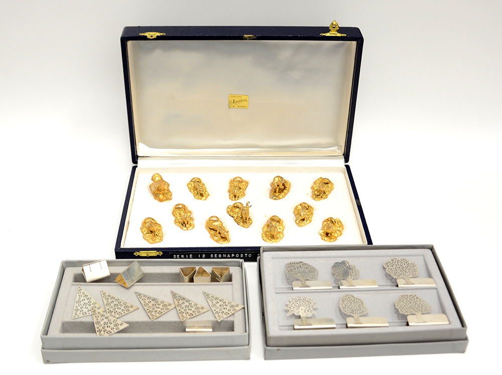 Lotto di dodici segnaposto in argento decorati ad animali a tutto tondo e altri dodici in argento marcati Vavassori, in custodia (difetti)