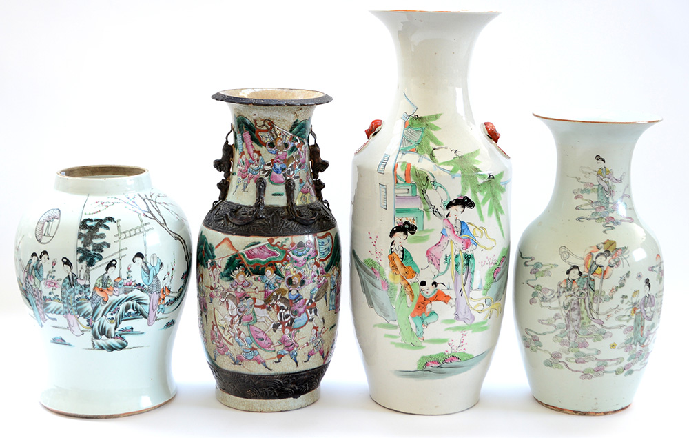 Quattro vasi in porcellana policroma a smalti con decori diversi (h. max cm 57,5) (difetti)