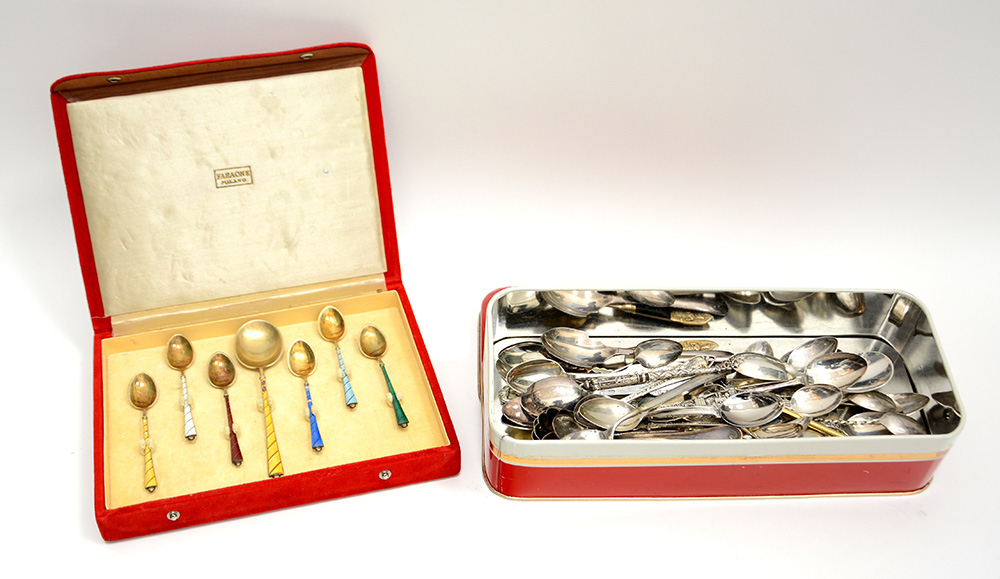 Lotto di due scatole contenenti numerosi cucchiaini in argento e metallo argentato, di cui sette danesi in argento dorato e smalti in custodia faraone (difetti)