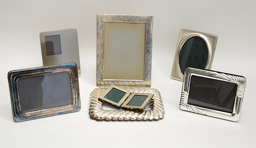 Lotto di sette cornici in lamina d'argento e metallo argentato (difetti)