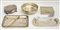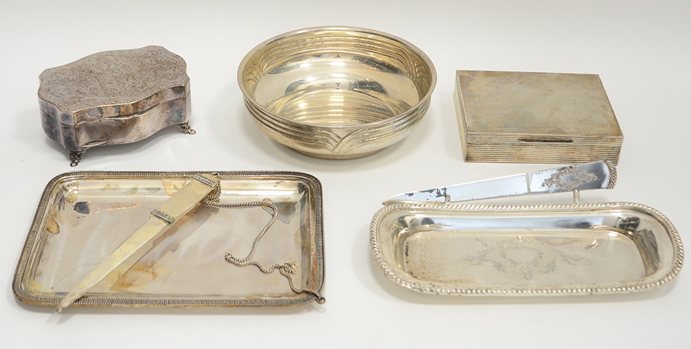 Lotto composto da due vassoietti con tagliacarte e una ciotola in argento e due cofanetti in lamina d'argento (g 800 ca.) (difetti)