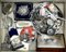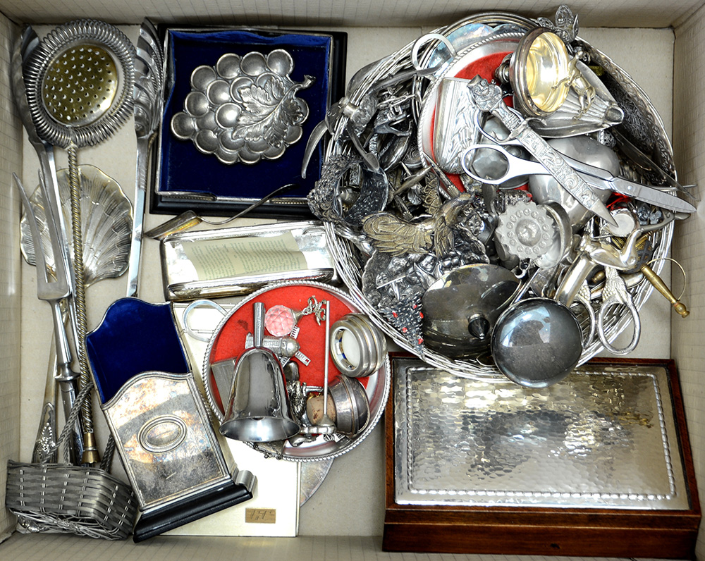 Cartone contenente numerose bomboniere ed altri oggetti per usi differenti in metallo argentato e argento (difetti)